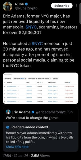 InevitableSwing [none/use name]@hexbear.netEnglish · 6 hours agoFormer NYC Mayor Eric Adams rugs his own memecoin just 30 minutes after launch and pockets over $2.5M - r/CryptoCurrency www.reddit.comexternal-linkmessage-square17linkfedilinkarrow-up172