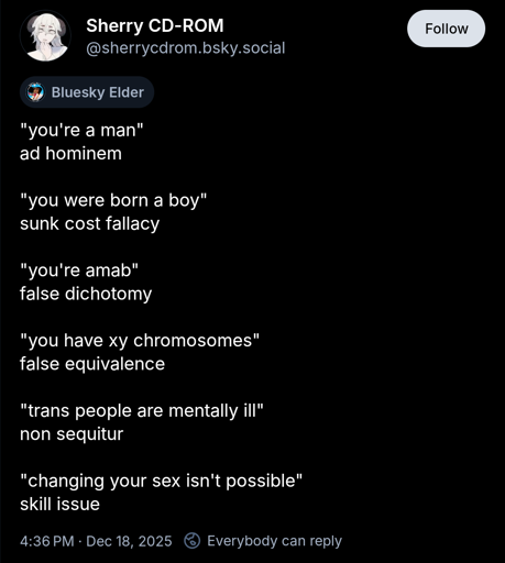 Carcharodonna [she/her]@hexbear.netMEnglish · 22 days agoHow to destroy transphobes with facts and logic 🤓hexbear.netimagemessage-square1linkfedilinkarrow-up10