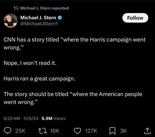 The Bar™ is dropping so low that it has reached levels previously believed to be impossible, but it makes me wonder what liberals would consider a bad campaign. Maybe it’s something like losing the Presidency, House, Senate, also participating in a genocide, and still thinking you did nothing wrong?