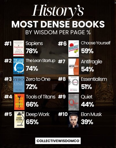 I don’t even read books. I just go through them and mark the smart-to-word ratio, then tally it up at the end to see how smart I won. Sapiens for example, 0.4:1. You won’t win any smart from that one.