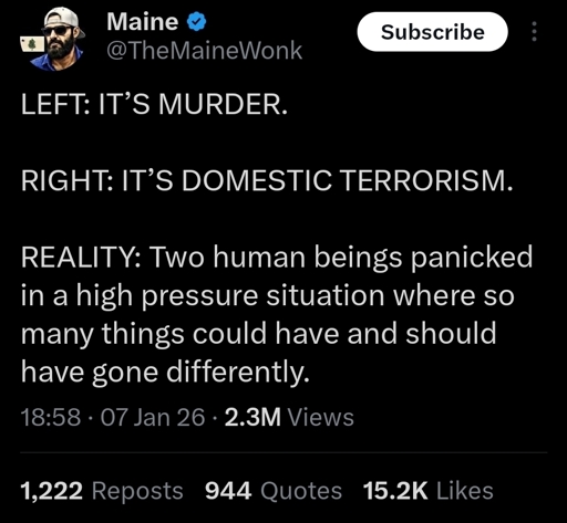 The ‘tried to hit me with their car’ defense almost never holds up in court so he probably will go to jail for murder… in like 4 years from now, when we will have either much more ICE or much less.