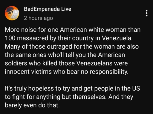 Seriously, how does he not know about the mass protest that broke out all over the United States? About the capturing of Nicolas Maduro was all over YouTube and social media. Sure, it was the stupid same rhetoric of, “I dont support Nicolas Maduro, but what the United States did was abhorrent”, which, granted, isn’t amazing, but that doesn’t change the fact that there’s still a large number of United States civilians that are incredibly upset with the United States actions in Venezuela.