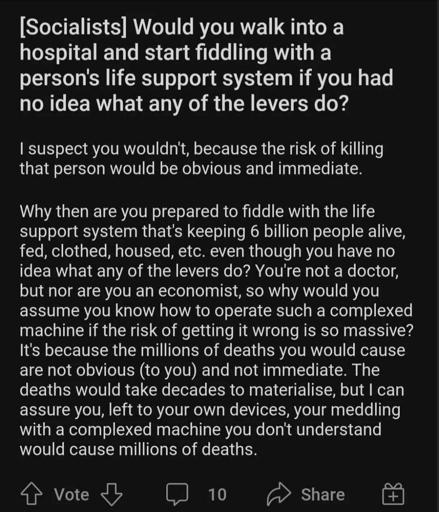 “Don’t you dare try to intervene in the economy! If you presume to then you are arrogant and power-hungry and your attempts to make positive change are surely doomed because this mystical economic system is far too complex for your tiny primate brain.”