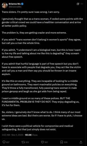 I think the only people who actually tolerate her are the center-right idpol only democrats. The ones who only care about culture war stuff and see Wu as “one of the good ones” without her being a hot woman and making themselves consider their own actual thoughts on gender and sex. Like the game industry people just generally didn’t like her, no one heard of her until Gamergate - and people still think she tried to get that heat to get fame.